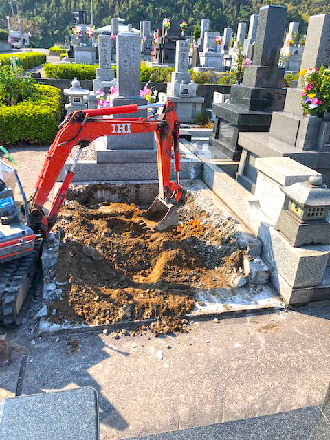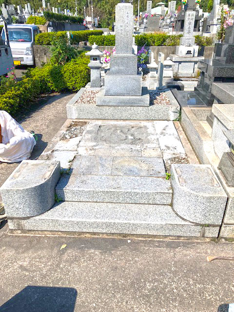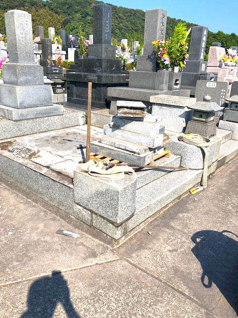 隣接するお墓に配慮しながら、墓石や外柵等を丁寧に解体・撤去していきます。